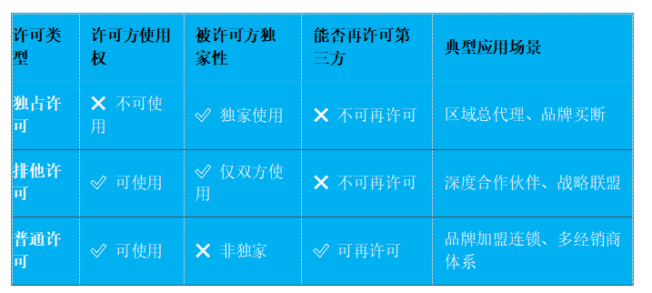 排他许可: 只有许可方和被许可方两方能使用,排除第三方。被许可方不能进行再许可。适合建立紧密的独家合作关系。