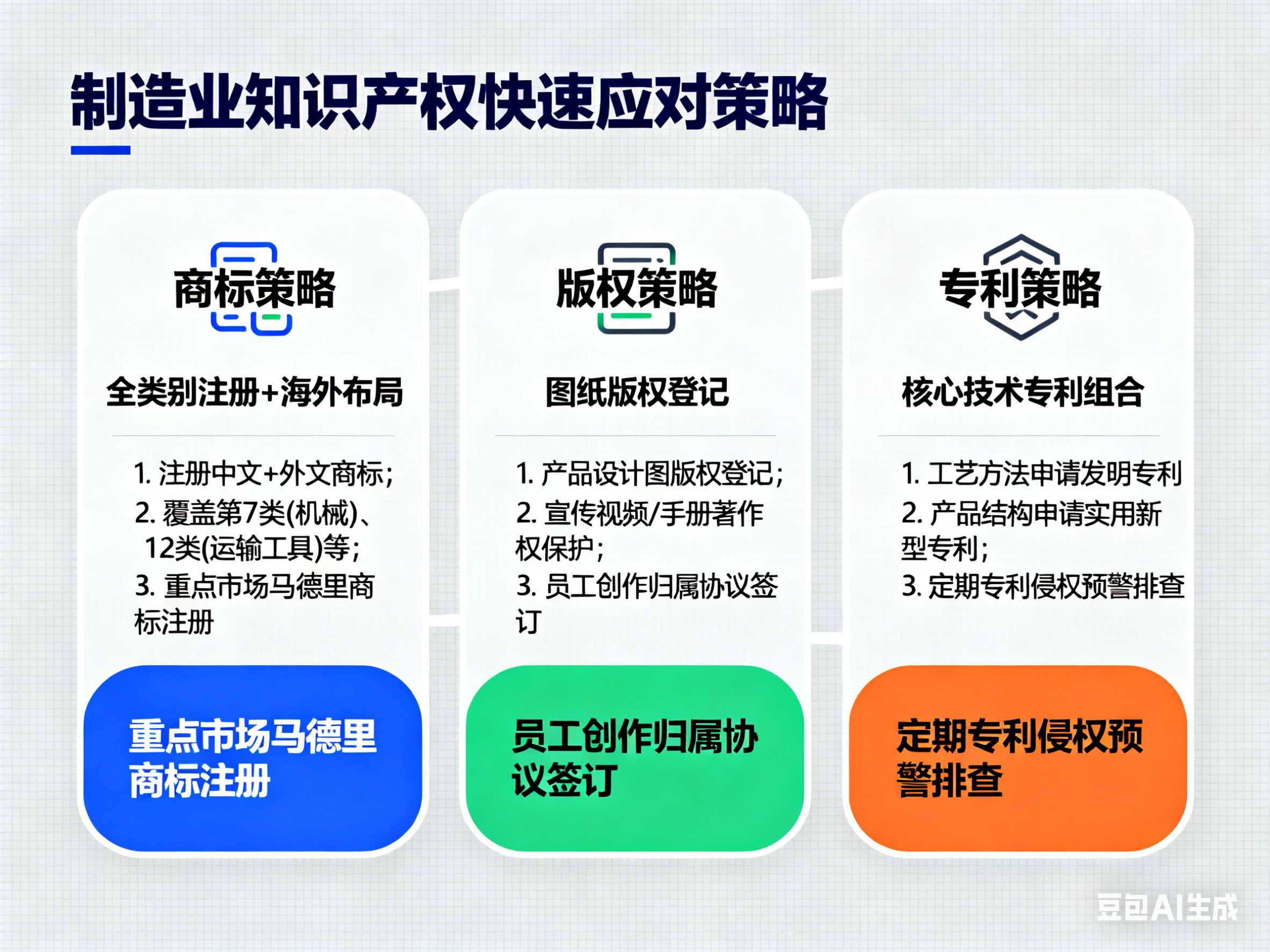 (2)制造业:是专利申请的密集区。围绕产品结构、生产工艺和设备创新,布局发明专利和实用新型专利。若涉及控制软件或管理系统,务必进行软件著作权登记。品牌商标注册同样不可或缺。