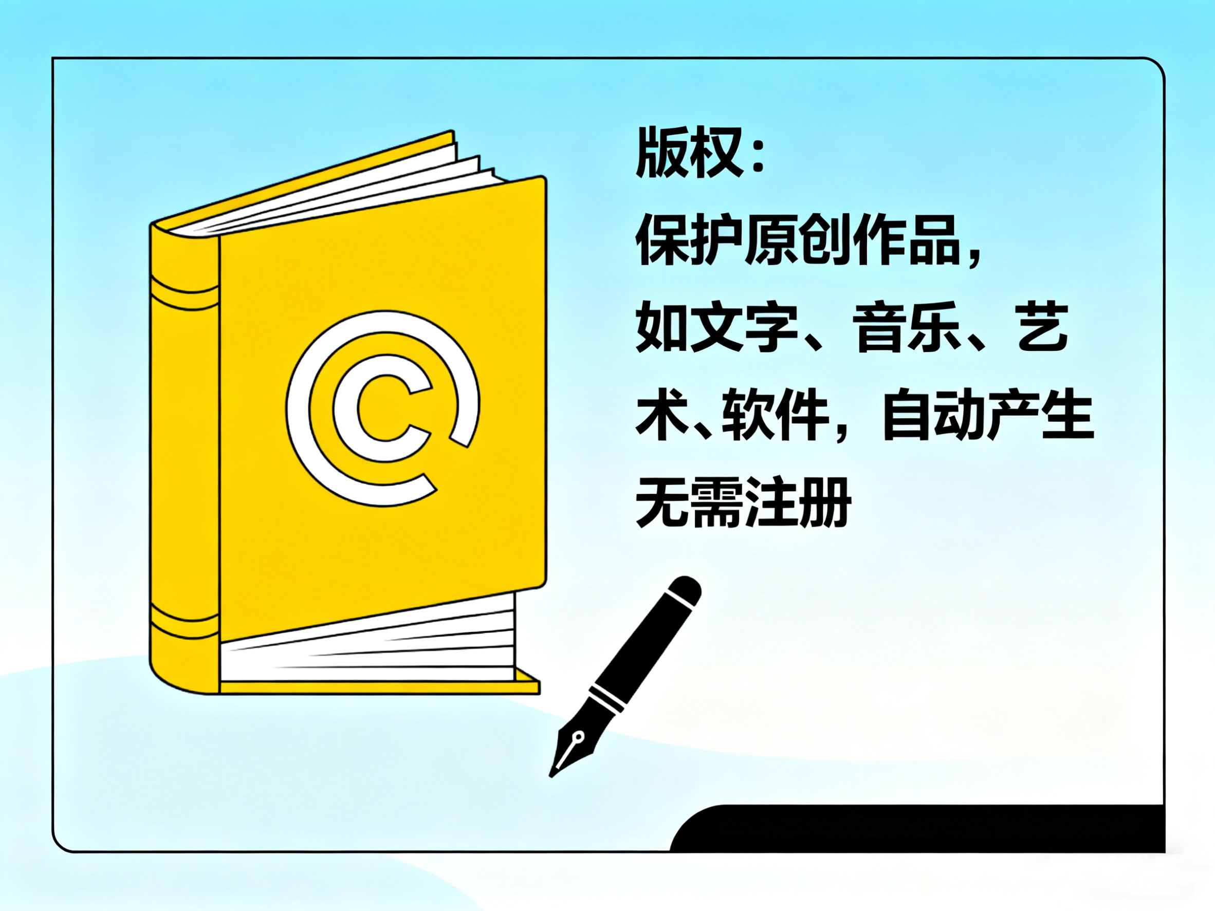 版权自动保护文学、艺术和科学领域内的原创作品(如软件代码、宣传文案、设计图纸、产品手册)。虽然版权自创作完成即产生,但进行版权登记(尤其是软件著作权登记)能为维权提供强有力的权属证明,保护期长达作者终生加50年。它保护的是表达形式,而非思想本身。