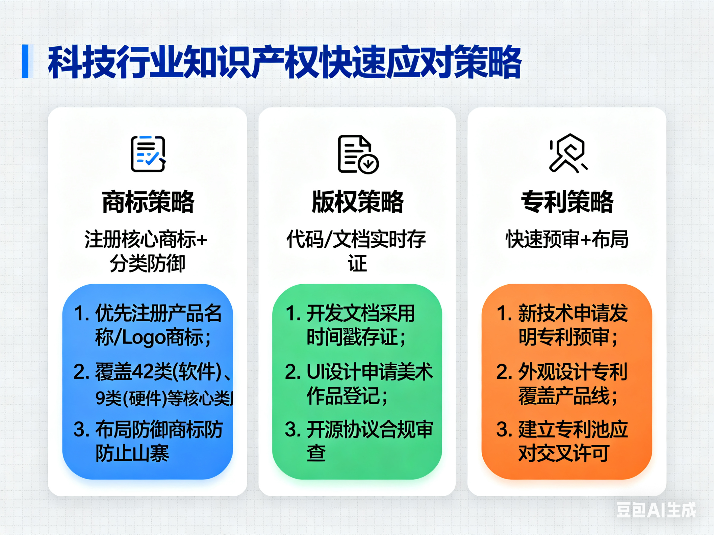 (1)科技行业:核心在于技术创新。应优先进行专利申请,特别是发明专利,以保护核心算法、硬件设计等。同时,辅以商标注册保护品牌名,并对开发文档等进行软件著作权登记。
