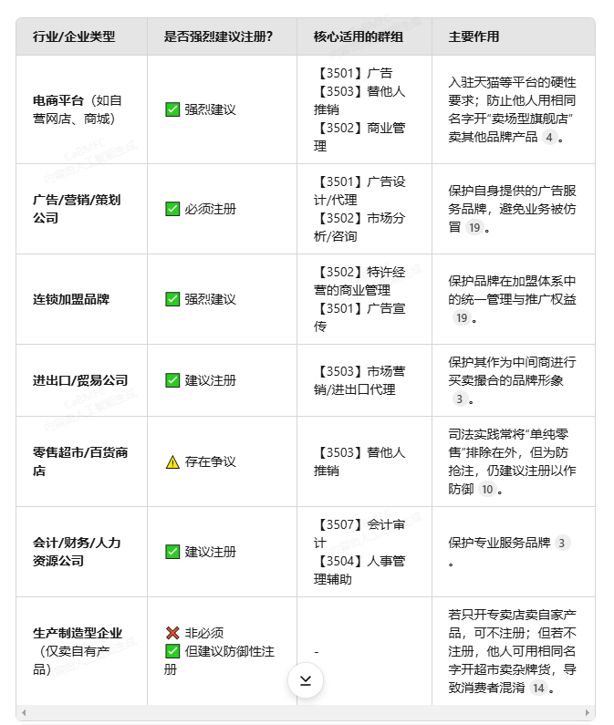 尽管有观点认为对其重要性存在“营销夸大”,但在当前电商主导的市场环境下,注册第35类已成为多数企业的标准配置。
