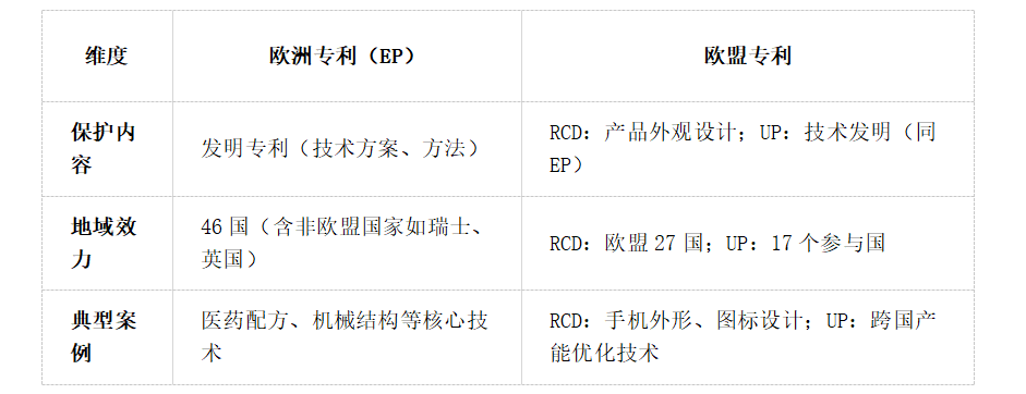 关键差异:欧洲专利覆盖更广(含非欧盟国),而欧盟专利聚焦欧盟内部,UP可简化多国保护流程。