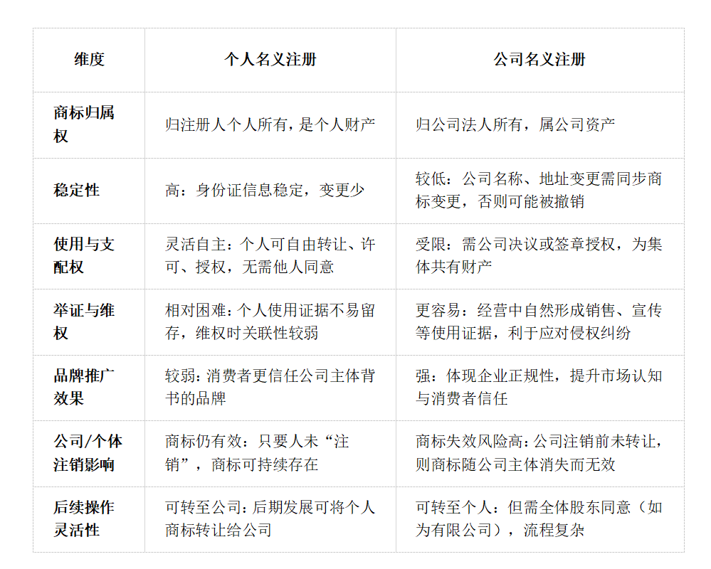 选择个人还是公司注册商标,本质是资产控制权与品牌发展路径之间的权衡: