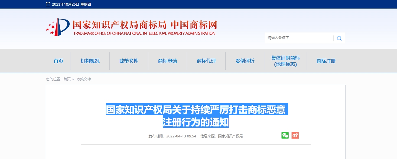 风清气正的商标注册管理秩序是推动知识产权事业高质量发展、营造良好创新环境和营商环境的重要基础。全国知识产权系统认真贯彻习近平总书记关于知识产权工作的重要指示论述,始终保持严厉打击商标恶意注册的高压态势,集中开展打击商标恶意抢注专项行动,常态化打击商标恶意囤积行为,取得明显成效。为进一步落实2022年全国知识产权局局长会议部署,以“零容忍”的态度持续严厉打击商标恶意注册行为,构建部门协同、上下联动、社会共治的工作新格局,保护市场主体合法权益,维护社会公共利益,加速推进我国由知识产权大国向知识产权强国转变,现就有关事项通知如下: